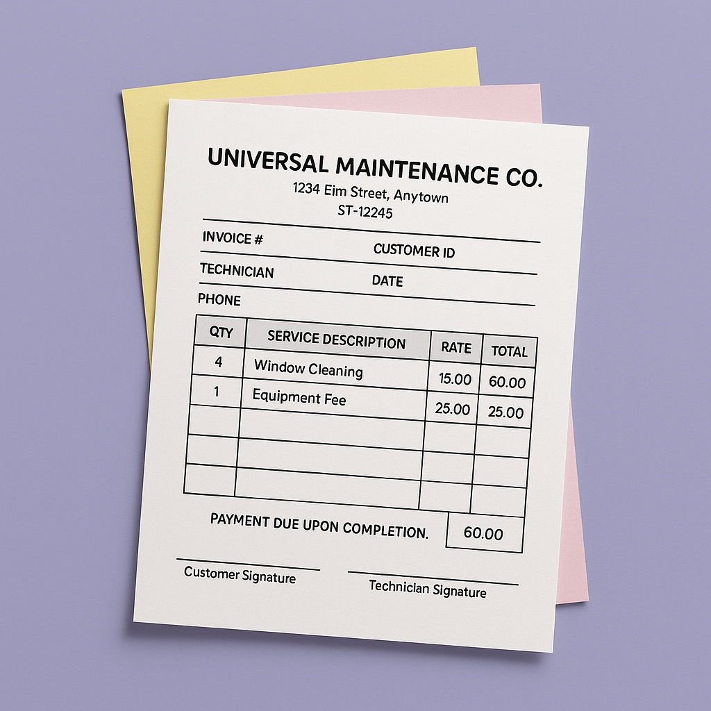 Professional, multi-page carbonless forms customized for your business needs. Perfect for invoices, work orders, service tickets, and internal records. Each set transfers writing clearly between sheets, keeping your workflow organized and accurate. Choose your preferred size, color option, and quantity — we’ll print and assemble your forms with crisp, dependable quality you can rely on every day.